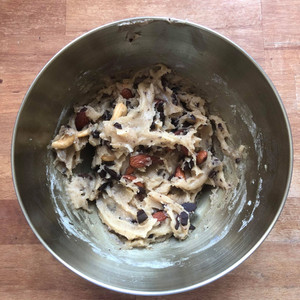 9. Ajouter la farine et la levure. Mélanger. Incorporer les pépites de chocolat et les fruits secs puis mélanger. Mettre la préparation au réfrigérateur 10 minutes.