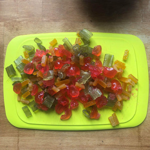 - 200gr de fruits confits (ici orange, bigarreaux, angélique)