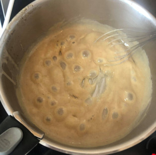 5. Une fois le mélange homogène, renverser le dans une casserole et faire cuire sur feu moyen jusqu'à ce que le caramel bouillonne et épaississe ; le tout sans jamais cesser de mélanger. Une fois que le caramel bout, laisser encore 30 secondes puis retirer la casserole du feu.